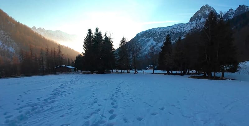 Prairie dégagé au bord de la route , avec quelques sapins, et la montagne sur le côté